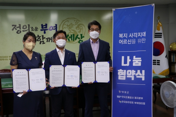 [충청뉴스큐] 부여군은 최근 한국조폐공사 제지본부와 한국야쿠르트 부여대리점과 폭염 취약 독거노인 안부확인 사업을 위한 협약식을 진행했다.