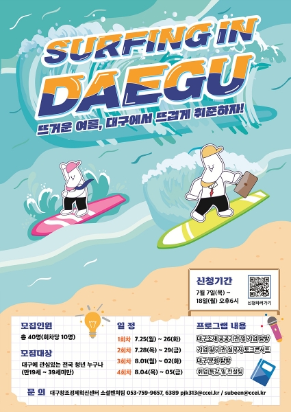 신청은 ‘대구창업허브’ 를 통해 할 수 있으며 서류평가를 거쳐 참가자 40명을 선발한다.