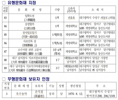 이번 지정된 신규 문화재는 대구시 문화재위원회 분과위원회의 심의를 통과하고 30일간의 예고 기간을 거쳐 지난 18일 문화재위원회에서 지정 결정 한 바 있다.