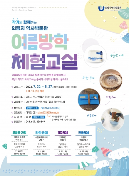 주요 내용으로 접시에 의림지를 그려 넣는 포슬린 아트부터 수달 라탄 트레이 만들기 가죽지갑 만들기 의림지 캔들 만들기 등의 공예체험이 이어질 예정이다.