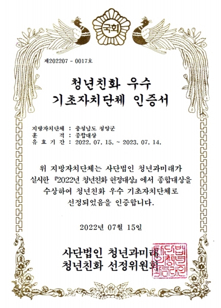 [충청뉴스큐] 농촌형 청년정책 추진에 역량을 집중하고 있는 청양군이 '2022 청년친화헌정대상' 종합대상을 수상하면서 청년친화 우수 지자체로 선정됐다고 19일 밝혔다.