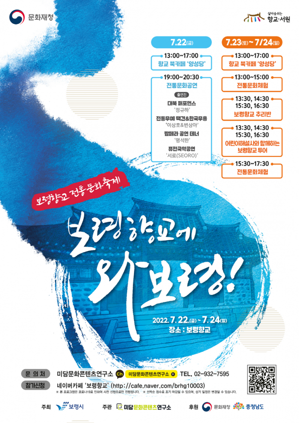 [충청뉴스큐] 보령시는 22일부터 24일까지 3일간 보령향교에서 향교·서원 문화재 활용사업의 일환으로써 시민과 관광객들을 위한 특별한 향교 축제를 개최한다.