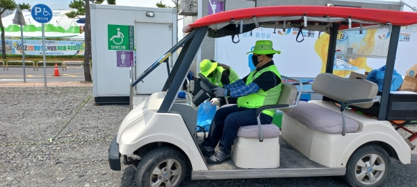 2인 1조로 전기차 2대가 배치되어 쓰레기를 하치장으로 운반하고 나머지 7명은 박람회장 내와 도로 주차장에 널려 있는 쓰레기를 청소해서 한곳으로 모으는 작업을 한다.