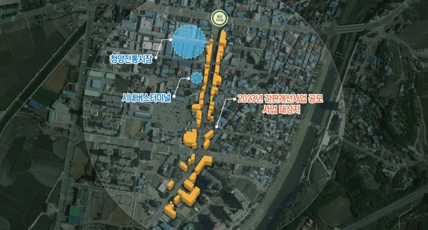 2023년부터 청양문화원 앞 사거리에서 시내버스 터미널 방면 700m 구간에 있는 건물 44동, 100개 업소의 간판을 개선한다는 내용이다.