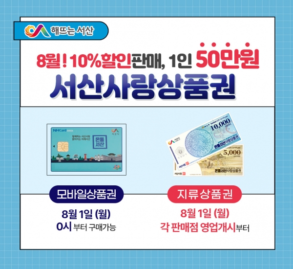 [충청뉴스큐] 충남 서산시가 오는 8월부터 온통서산사랑상품권의 1인 구매 한도를 상향한다.