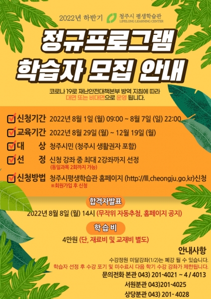신청 및 접수기간은 오는 8월 1일부터 7일까지 7일간으로 청주시평생학습관 홈페이지를 통해 신청할 수 있다.