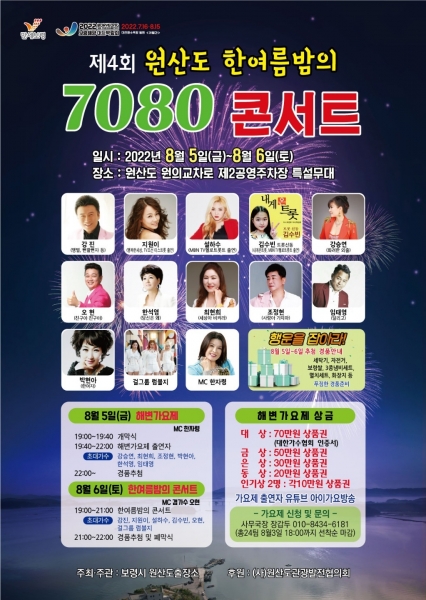 원산도해수욕장 제2공영주차장 특설무대에서 열리는 ‘2022년 한여름밤 7080 콘서트’는 보령해양머드박람회 기간 원산도를 방문한 관광객들과 주민들에게 한숨 쉬어갈 수 있는 휴식 시간을 제공하고자 마련됐다.