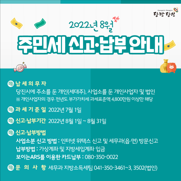 [충청뉴스큐] 당진시는 7월 1일 기준 당진시에 주소를 둔 개인에게 부과되는 주민세 개인분을 7억 3천만원과 사업소분 주민세를 부과했다고 밝혔다.