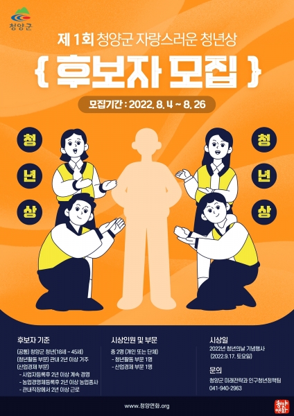 [충청뉴스큐] 청양군이 ‘자랑스러운 청년상’을 제정하고 첫 번째 수상 후보자 추천을 접수한다고 9일 밝혔다.