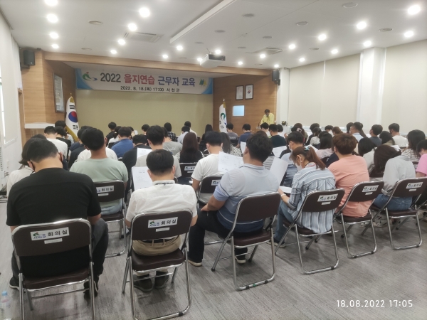 [충청뉴스큐] 서천군이 지난 18일 군청 대회의실에서 을지연습 근무자 100여명을 대상으로 2022년 을지연습 대비 근무자 사전교육을 실시했다.