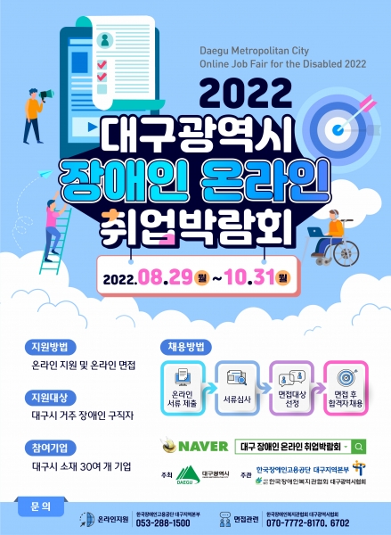 [충청뉴스큐] 대구시는 코로나19 이후 일상 회복 및 취업에 어려움을 겪는 장애인의 맞춤형 취업 지원을 위해 8월 29일부터 10월 31일까지 ‘대구 장애인온라인 취업박람회’를 개최한다.
