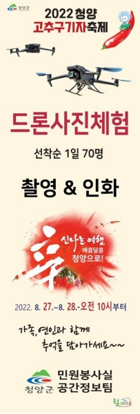 [충청뉴스큐] 청양군 민원봉사실 소속 드론 비행대가 2022 청양고추·구기자 축제 기간 중 27일과 28일 축제장 방문객을 대상으로 드론 사진 촬영과 인화 체험 부스를 운영한다고 24일 밝혔다하루 70명씩 선착순으로 제공되는 사진 촬영 체험은 드론 부스 옆 포토존에서 가능하다.