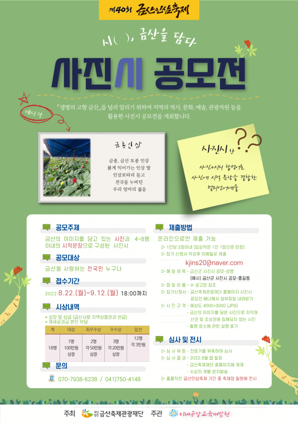 [충청뉴스큐] 금산군은 제40회 금산인삼축제를 기념해 금산을 널리 알리기 위해 ‘시, 금산을 담다’ 라는 주제로 사진시 공모전을 개최한다.