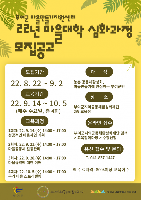 [충청뉴스큐] 부여군 지역공동체활성화재단에서 운영하는 마을만들기 지원센터가 ‘마을대학 심화과정’을 연다.