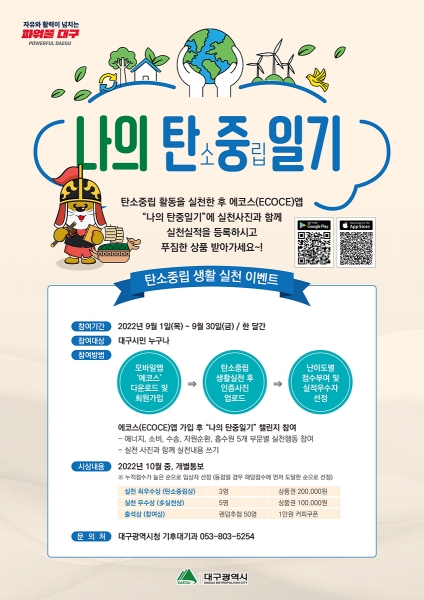대구시는 탄소중립의 공감대를 넓히고 탄소줄이기의 생활화를 유도하기 위해 시민 누구나 참여할 수 있는 실천활동인 ‘나의 탄중일기’를 운영한다.