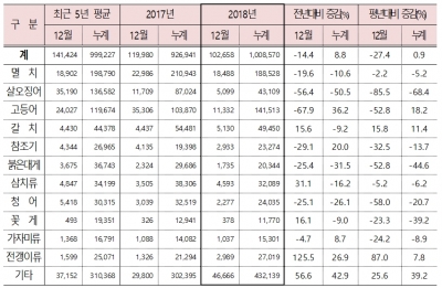 살오징어, 붉은대게, 청어 등은 전년 대비 감소했다.