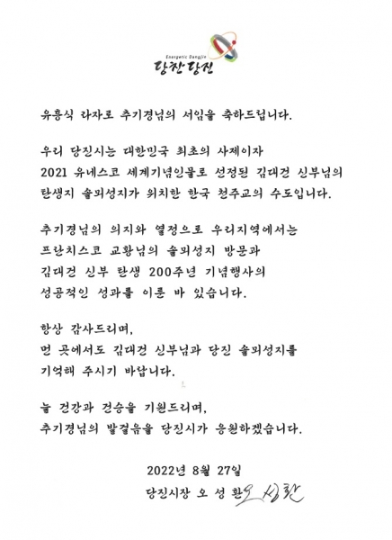 [충청뉴스큐] 오성환 당진시장이 지난 27일 대한민국에서 4번째로 추기경으로 서임된 유흥식 추기경에게 축하 서한문을 보냈다.