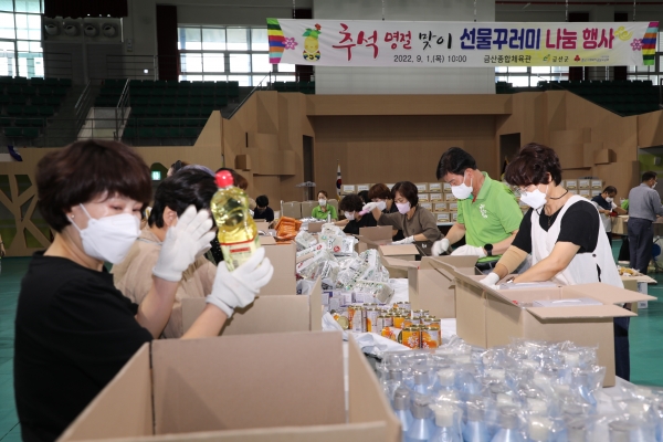 [충청뉴스큐] 금산군은 지난 1일 금산종합체육관에서 읍면 지역사회보장협의체와 함께 추석명절 맞이 선물꾸러미 나눔에 나섰다.