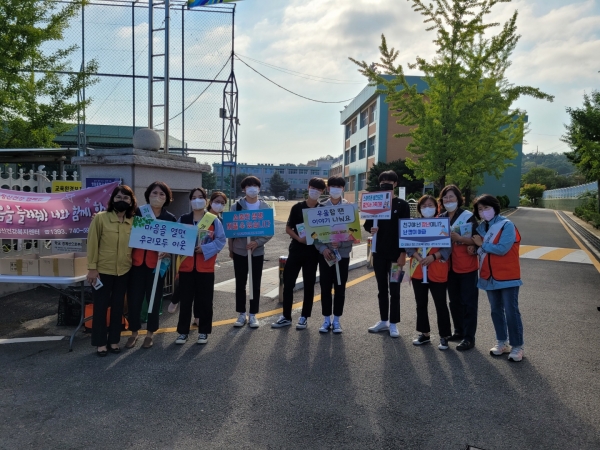 학생들 등교시간에 맞춰 생명존중 구호를 외치고 홍보물을 배부하며 학생들의 관심을 유도했다.