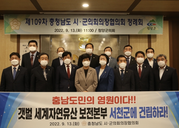 [충청뉴스큐] 충청남도 시군의회 의장협의회는 13일 제109차 정례회에서 서천군 김경제 의장이 대표 발의한 ‘갯벌 세계자연유산 보전본부 서천군 유치 결의문’을 채택했다.