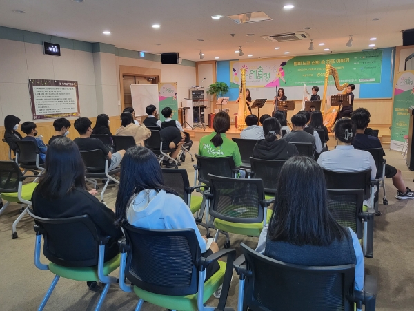 [충청뉴스큐] 금산청소년미래센터는 지난 13일 2층 다목적강당에서 신나는 예술여행 2차 공연 앙상블 더 하프의 ‘별의 노래 신화 속 하프 이야기’를 개최했다.