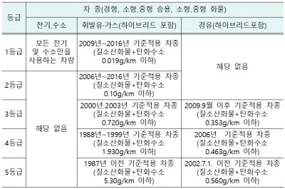선정기준은 차령이 오래된 순이며, 지원금액은 차종 및 연식에 따라 보험개발원이 산정한 분기별 차량기준가액에 따라 다르며, 총중량 3.5톤 미만의 경우 최고 165만원, 총중량 3.5톤 이상은 조기폐차 보조금과 폐차 후 신차 구매시 440만원에서 최고 3,000만원까지 지원 받는다.
