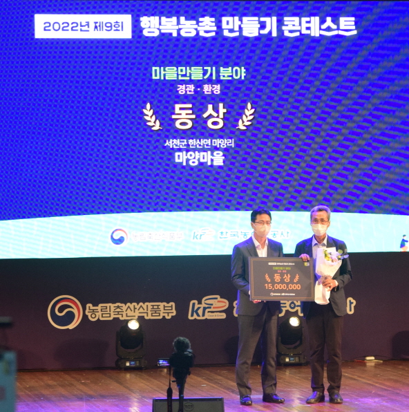 [충청뉴스큐] 서천군지속가능지역재단이 지난 22일 농림축산식품부와 한국농어촌공사 주관으로 KT대전인재개발원에서 열린 제9회 행복농촌만들기콘테스트 경관·환경 분야에서 한산면 마양리마을이 ‘동상’을 수상하는 쾌거를 올렸다.