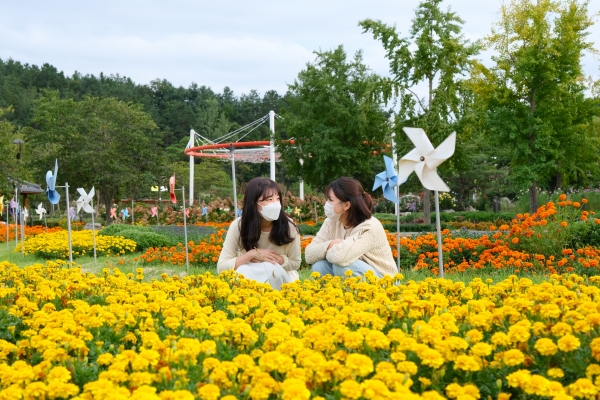 공원 입구와 주요 산책길에 ‘가을의 전령’ 코스모스부터 시작해 국화 등 수많은 가을 꽃들이 자태를 뽐내며 군민들과 관광객들을 반기고 있다.