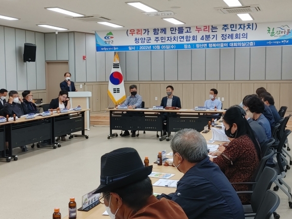 [충청뉴스큐] 청양군 주민자치연합회가 지난 5일 오후 정산면행복마을터 2층 대회의실에서 4분기 정례회의를 열고 12월 개최 예정인 주민자치 한마당 행사 장소와 세부 일정을 논의했다.