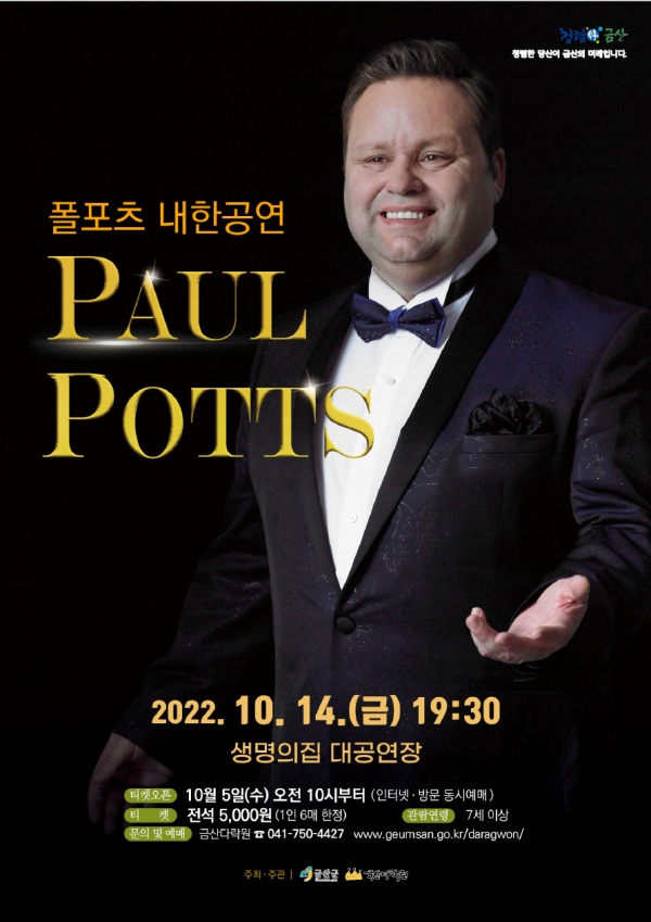 군 관계자는 “기적의 목소리로 희망의 아이콘으로 알려진 폴포츠 15주년 기념 콘서트가 금산군에서 열린다”며 “앞으로도 수준높은 세계적 공연을 선보일 수 있도록 최선을 다하겠다”고 말했다.