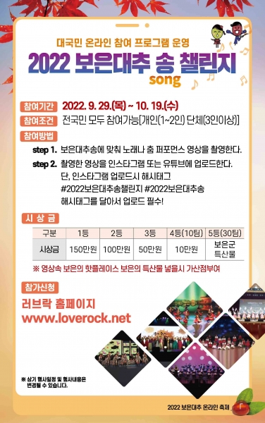 군은 온라인으로 개최되는 이번 대추축제에 대한 국민적 관심과 열기를 높이기 위해 ‘2022 전국민 보은대추송 챌린지’에 총상금 500만원을 내걸었다.