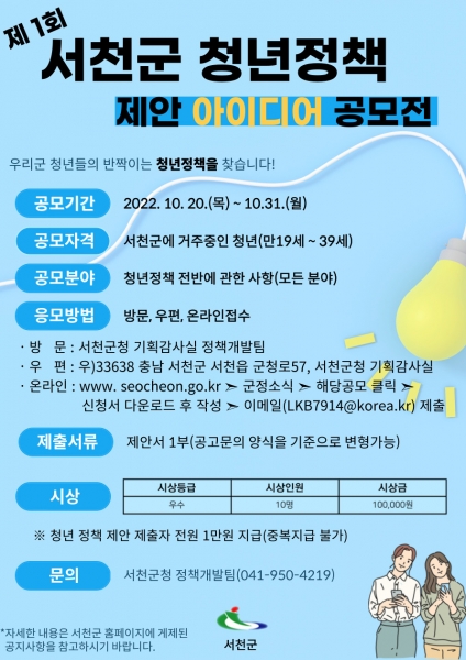 [충청뉴스큐] 서천군이 오는 31일까지 청년이 직접 제안하는 참신하고 혁신적인 아이디어를 청년정책에 반영하기 위해‘청년정책 제안 아이디어 공모전’을 개최한다.