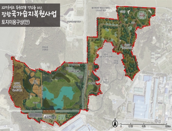 새 정부 국정과제이자 김기웅 군수의 민선8기 공약 중 하나인 ‘장항 국가습지복원사업’의 대상 면적은 총 56만m2로 습지 복원 도시생태복원 전망시설 설치 탐방로 조성의 4개 사업에 2024년부터 2029년까지 6년 동안 총 913억원을 투입할 계획이라고 전했다.