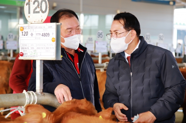 [충청뉴스큐] 이완섭 서산시장은 18일 오전 음암면 상홍리에 있는 가축경매시장을 방문해 사료값 상승으로 어려움을 겪는 한우농가와 축산 관계자를 격려했다.