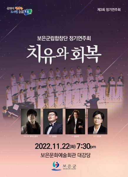 [충청뉴스큐] 보은군은 오는 22일 저녁 7시 30분 보은문화예술회관에서‘제3회 보은군립합창단 정기연주회’를 개최한다고 밝혔다.