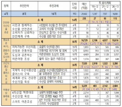 부산 수산업·어촌 혁신발전 2030계획은 4대 정책, 8대 전략, 16대 과제, 113개 세부사업으로 구성되고 총 사업비 2조 9천억 원이 투입된다. 최초 수립된 계획의 재 검토과정에서 불필요한 사업과 실현 불가능한 사업을 배제해 실효성을 제고한 결과 7개 전략과 6개의 과제, 35개 사업을 삭제하고 2천억 원의 사업비를 삭감했다.