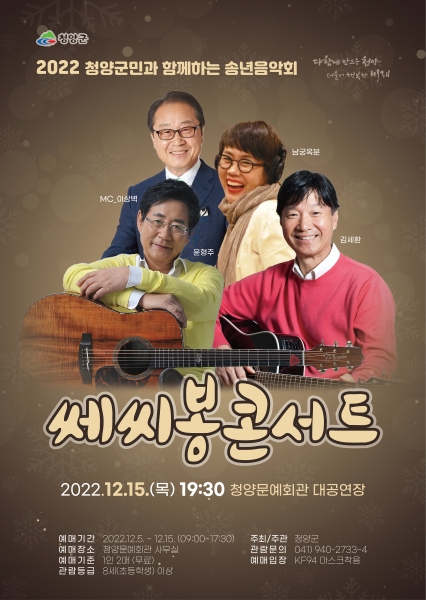 2022 청양군민 송년 음악회로 진행되는 이날 콘서트는 1960~70년대를 풍미했던 쎄시봉 멤버들이 출연해 추억의 이야기와 노래를 관객들에게 들려준다.