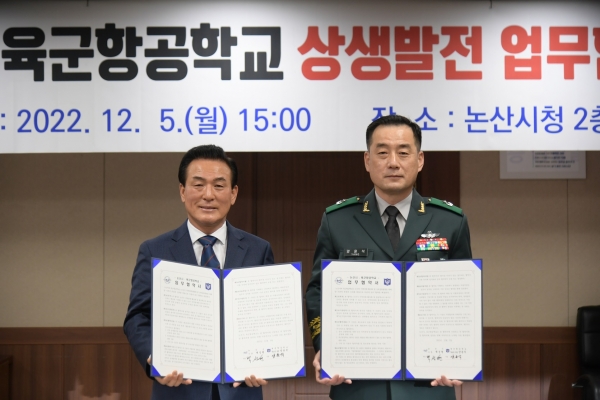 [충청뉴스큐] 논산시가 지난 5일 논산시청 상황실에서 육군항공학교와 상생발전·협력을 도모하기 위한 업무협약을 체결했다.