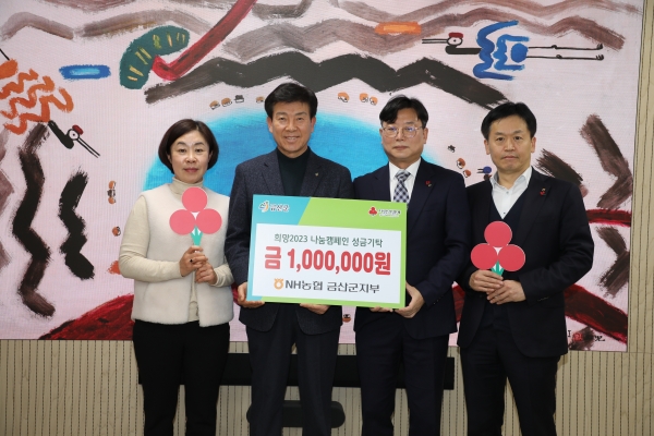 매년 연말연시 명절 백미·떡꾹떡 기부 및 장학금 지급, 헌혈캠페인, 청소 봉사 등에 나서고 있는 NH농협은행 금산군지부는 같은날 희망2023나눔캠페인 성금 100만원을 전달했다.