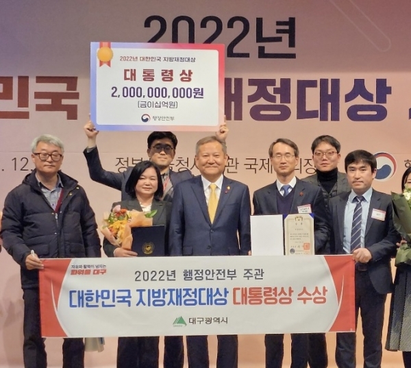 2022년 지방자치단체 재정분석 최우수단체 선정세 번째로 대구시는 행정안전부가 전국 243개 지방자치단체를 대상으로 실시한 2022년 지방자치단체 재정분석 결과 최우수단체로 선정되어 특별교부세 5천만원을 받았다.