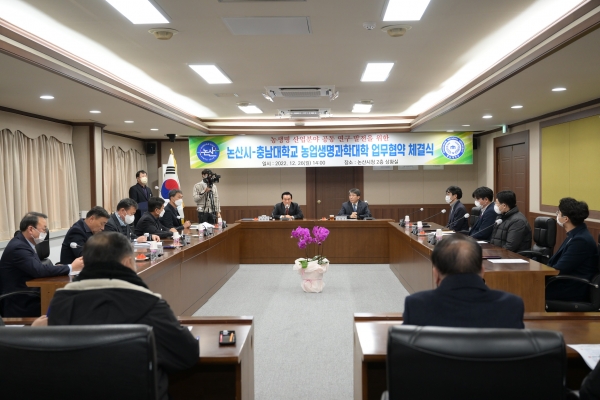 [충청뉴스큐] 논산시와 충남대학교 농업생명과학대학이 지난 26일 논산시청에서 ‘농생명 산업분야 연구·발전을 위한 업무협약’을 체결, 농업 혁신에 힘을 합친다.