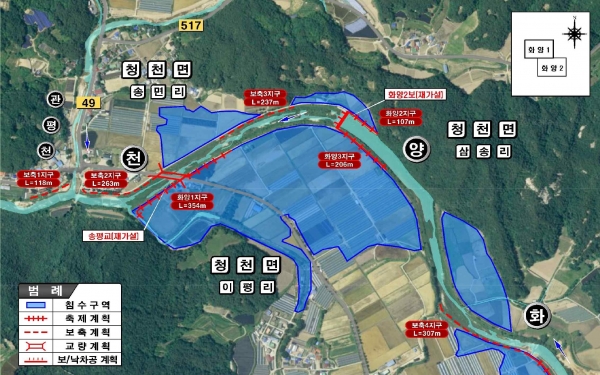 괴산군은 화양지구에 내년부터 2025년까지 3년간 120억원을 투입해 청천면 송면리에서 삼송리까지 제방정비 2.53km, 교량 2개소 재가설 등 화양천을 정비하며 하천 범람 및 저지대 상습침수 피해를 예방해 나갈 계획이라고 전했다.