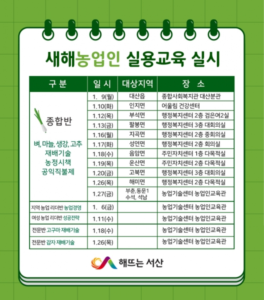 이완섭 서산시장은 "매년 연초에 실시하는 새해 농업인 실용교육은 한해 농사의 토대가 되는 교육“이라며 ”많이 참여해 농업에 필요한 알찬 정보를 얻고 가시길 바란다"고 전했다.