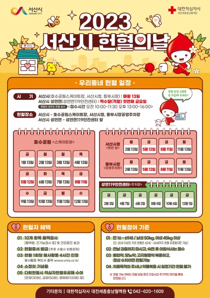 사랑의 헌혈의 날은 매달 13일에 호수공원에서 운영되며 2월, 5월, 8월, 11월은 호수공원과 서산시청 현관 앞, 동부시장 공영주차장에서 동시에 운영된다.