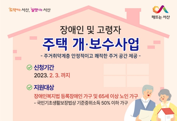 [충청뉴스큐] 충남 서산시는 주거 취약계층 가구를 대상으로 노후된 주택 개·보수 비용을 지원하는 ‘장애인 및 고령자 주택 개·보수사업’ 신청을 2월 3일까지 신청받는다고 12일 밝혔다.