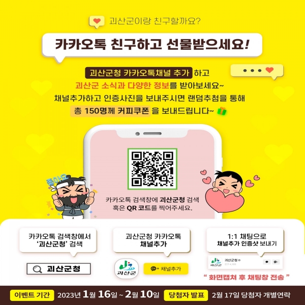 괴산군은 카카오톡 채널 친구 추가 이벤트에 응모한 회원 가운데 150명을 추첨해 커피쿠폰을 증정한다.