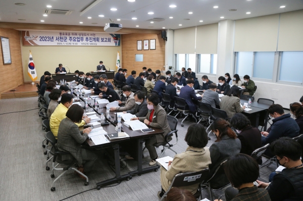 [충청뉴스큐] 서천군이 지난 12일 군청 대회의실에서 김기웅 서천군수를 비롯한 부서장과 읍면장이 참석한 가운데 2023년 주요업무 추진계획 보고회를 개최했다.