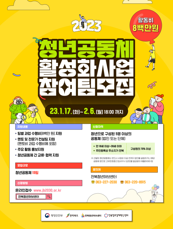 [충청뉴스큐] 전라북도와 전북청년허브센터는 ‘23년 청년공동체 활성화 사업’에 참여할 청년공동체를 1월 17일부터 2월 6일까지 모집한다고 밝혔다.