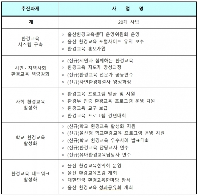 울산환경교육센터는 올해 환경교육 인프라 구축, 시민·지역사회 환경교육 역량 강화, 사회환경교육 활성화, 학교환경교육 활성화, 환경교육 네트워크 활성화 의 5개 분야, 20개 사업을 운영한다.