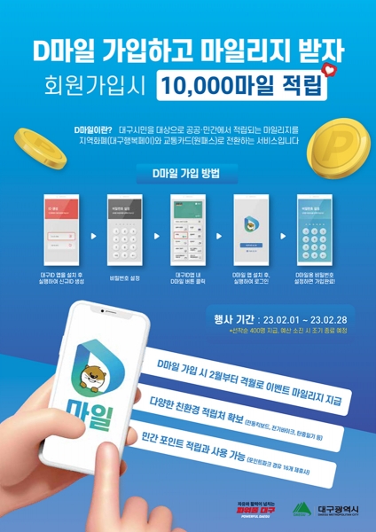 [충청뉴스큐] 대구시는 2월 1일 09시부터 마일리지 통합 플랫폼인 ‘D마일’앱에 신규 가입하는 회원 400명에게 1만 마일리지를 지급한다.